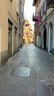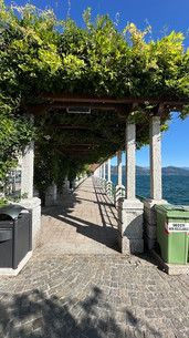Lungo questa passeggiata del lungolago ci sono molti bar, ristoranti e caffé dove i visitatori possono gustare un pasto o un drink. Da qui cammino attraverso il bellissimo pergolato di glicine che, al momento giusto, è assolutamente spettacolare con i suoi grandi fiori violacei. Alla mia sinistra vedo le mura che esistevano a difesa della città ma che Napoleone utilizzò i materiali per costruire Via Sempione.