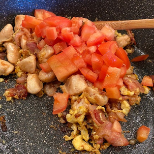 Heat oil in large skillet and add bacon, chicken, and shallots