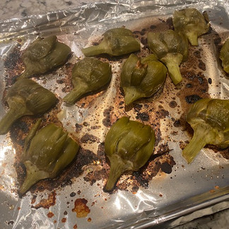 At this time you can peel your garlic and place one clove into each whole where the choke used to be then top with one piece of lemon