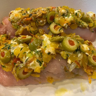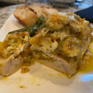 Add chicken and top each piece with 1/2 of the remaining veggie mix