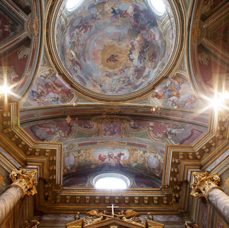 The dome was created by architect Rovere in 1832 and then painter Giuseppe Toselli frescoed the Assumption of the Virgin and the participation of the patrons of Cuneo: Saint Michael, Saint John the Baptist and the blessed Angelo Carletti on the dome in 1834.