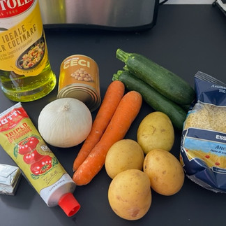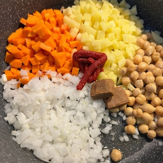 Place potatoes, carrots, onions, chick peas, tomato paste and bullions in large sauce pan