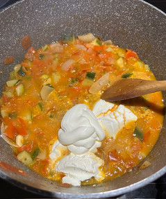 Aggiungi il formaggio cremoso e la panna e mescoli bene, poi aggiungi sale e pepe a piacere