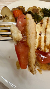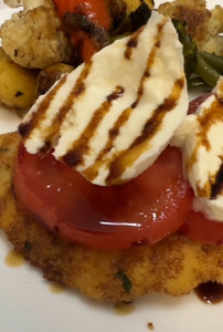 Baked cutlets then topped with fresh tomatoes, buffalo mozzarella, olive oil, some salt, oregano and a good balsamic vinegar makes this a delicious option instead of chicken parmigiana. I served this with my Balsamic Veggie and it was a delicious meal.