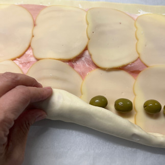 Adagi le olive sopra il formaggio a circa 5cm dal bordo