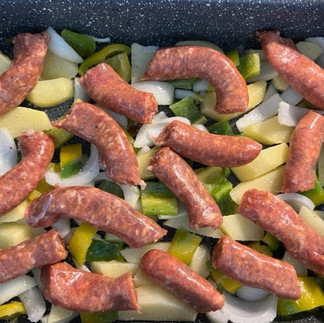 Roasted veggies and sausage are great as a warm salad with some slices of baguette bread. Great for a cold night where the oven warms up the house as well as makes it smell wonderful.
