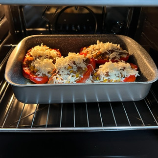 Scoop ¼ of the meat mixture in each half of the large peppers. If you use 4 smaller peppers divide meat into 8ths