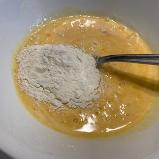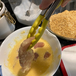 Using tongs dip chicken in egg flour mixture then into breadcrumb mixture