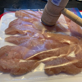 Using a Ziploc bag lay chicken inside bag and pound it to ½ inch thick, do this until all chicken has been pounded