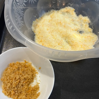 In una seconda piccola ciotola aggiungi lo zucchero di canna e la scorza rimanente e strofini la scorza nello zucchero. Metti da parte