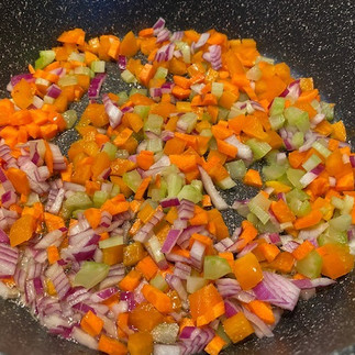 Heat oil in skillet and sauté onion, celery, carrot and pepper for five minutes