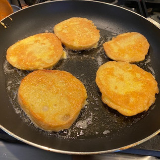 Dip slices of bread into egg mixture and cook until egg is golden on both sides, then place on baking sheet. Do this until all the bread has been cooked. Let bread cool