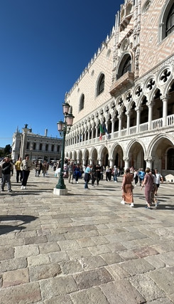 On the opposite side is the Ducale Palace with arcades at ground level and a loggia on the upper floor. This palace is built in Venetian Gothic style and a true landmark in Venezia. Built in 810 and rebuilt in 1340, it included government offices, the jail and the residence of the Doge (leader) of Venezia (highest role in Venezia).