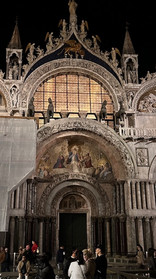 The marble façade dates back to 13th century and mosaics and bas-reliefs were added. The two entrance doors at the ends are of Arab inspiration with inflected arch tympanums. The only mosaic remaining from the original 13th century is above the first portal on the left which represents the entrance of the body of San Marco into the basilica. All the others were damaged and redone between the 17th and 19th centuries.
