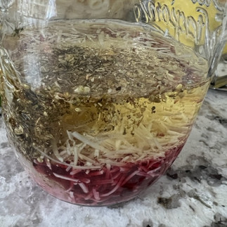 In un barattolo mescoli insieme olio, aceto, formaggio, origano, sale e pepe e metti da parte