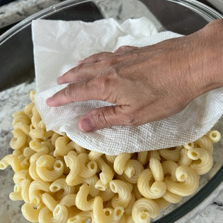 Metti la pasta in una ciotola capiente che può essere sigillata e con un tovagliolo di carta asciugi la pasta il più possibile