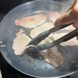 In una padella aggiungi 1/2 cucchiaino di olio d'oliva e cuoci i filetti di maiale fino a quando non saranno dorati. Per la dieta di Gianni, non sono in grado di friggere, quindi ho aggiunto un po' d'acqua per cuocere completamente i filetti