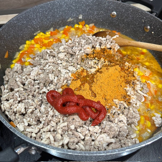 Rimetti la carne nella padella e unisci il composto di fajita, il concentrato di pomodoro e il brodo e lasci sobbollire fino a quando il liquido non sarà evaporato. Se le verdure non sono ancora cotte, aggiungi altro brodo per assicurarsi che tutto sia cotto
