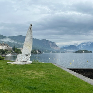 This statue Monumento "Torri Gemelle" is to honour those that died in 911. It was created in stainless steel by Ilirjan Xhixha (Albanian Sculptor) and dedicated in 2002. Six vertical rectangular columns and six stars represent both the Twin Towers and the American flag. Located on front lawn of the Grand Hotel des Iles Borromees, overlooking Lake Maggiore, it is a stunning piece of art. The plaque next to it has a beautiful dedication:
