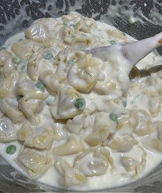Tortellini alla Panna has always been a pasta that the whole family loves. To the roux I add onions, whip cream, layers of cheese and peas which makes this pasta very creamy and delicious.