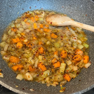 Add onion, carrots, celery and garlic into pan and sauté for five minutes, stirring frequently until onions are translucent