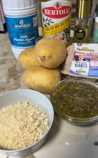 Spalmi un po' di pesto sulle patate, e spezzetti la mozzarella e ricopri il pesto
